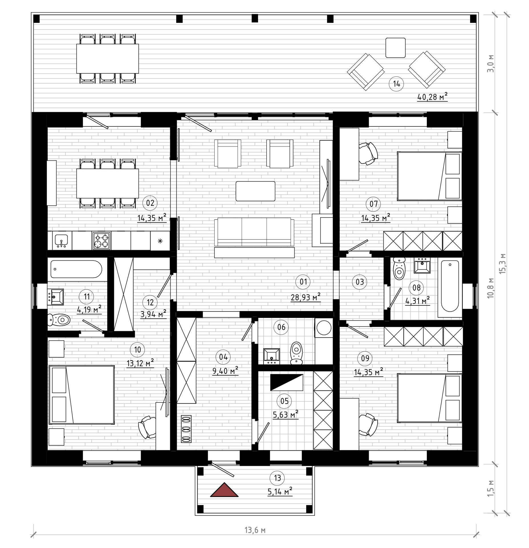 Габариты без террасы: 13,6х12,1 м